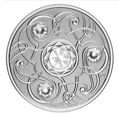 Lícová strana zachycuje profil královny Alžběty II. Rubová strana zachycuje Barevný krystal Swarovski® ve středu, který je obklopen třemi menšími krystaly Swarovski® v pozadí je mince zdobena keltským uměleckým designem.