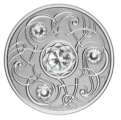 Lícová strana zachycuje profil královny Alžběty II. Rubová strana zachycuje Barevný krystal Swarovski® ve středu, který je obklopen třemi menšími krystaly Swarovski® v pozadí je mince zdobena keltským uměleckým designem.