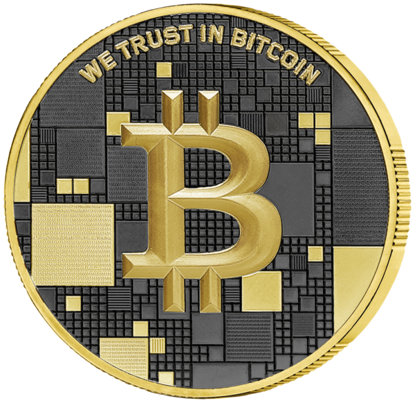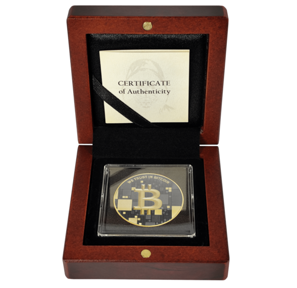 Na přední straně je výrazně vyobrazen ikonický symbol Bitcoinu, který je orámován detailním vyobrazením technologie blockchain. Nápis „We trust in Bitcoin“ posiluje důvěru v decentralizovanou měnu a odráží globální potenciál této digitální revoluce.