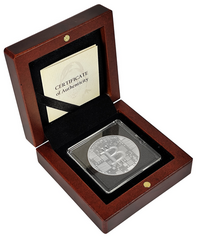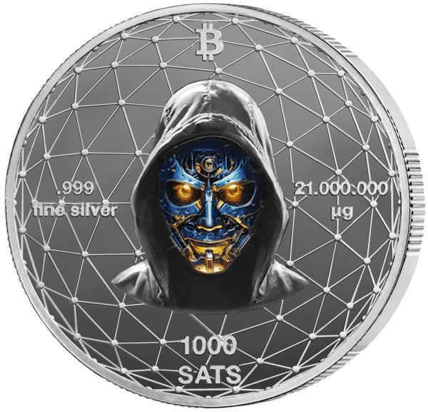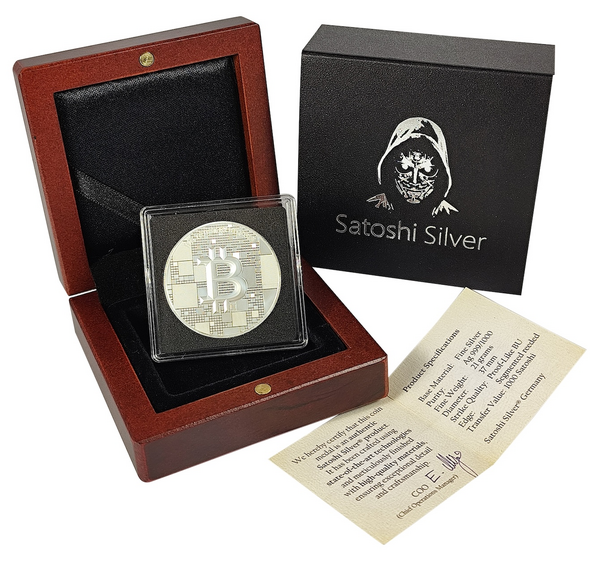 Váží 21 gramů ryzího stříbra (což odpovídá 21 000 000 mikrogramů, což je hodnota odpovídající maximální zásobě 21 milionů bitcoinů). Tyto mince jsou cenným sběratelským artiklem, který symbolicky zachycuje význam Bitcoinu a technologie blockchain.
