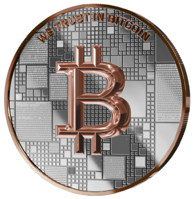 Na přední straně je výrazně vyobrazen ikonický symbol Bitcoinu, který je orámován detailním vyobrazením technologie blockchain. Nápis „We trust in Bitcoin“ posiluje důvěru v decentralizovanou měnu a odráží globální potenciál této digitální revoluce.