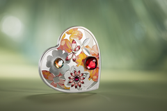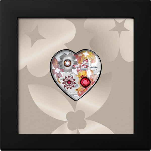 Tato mimořádná mince ve tvaru srdce, ražená v klasickém stylu, spojuje umělecký cit s moderním designem.