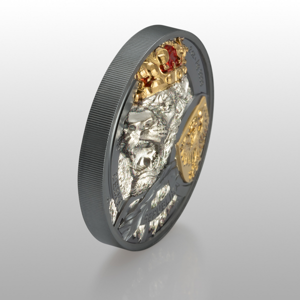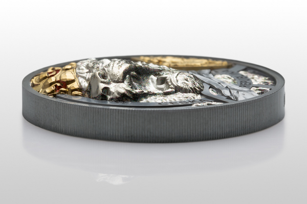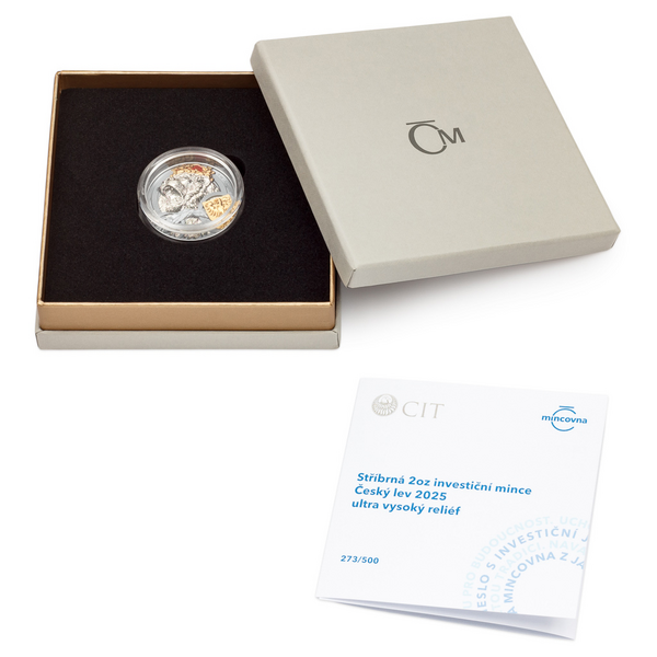 Unikátní varianta investiční mince Český lev, která vznikla ve spolupráci České mincovny a společnosti CIT Coin Invest, se pyšní extrémně vysokým reliéfem. Mimořádná hloubka plastiky poskytla jedinečnou příležitost pro úpravu reliéfu, a lev tak má – oproti dalším mincím s ročníkem 2025 – otevřenou tlamu. Řvoucí šelma se objevuje ve dvou trojských uncích ryzího stříbra zkrášlených selektivním pozlacením, kolorováním a technologií black proof. Mince je navíc číslována na hraně.