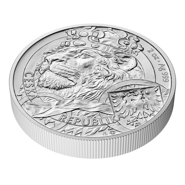 Stříbrná mince velikosti dvou uncí v kvalitě BU ze série věnované jednomu ze státních symbolů České republiky - Český lev pro rok 2025.