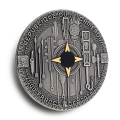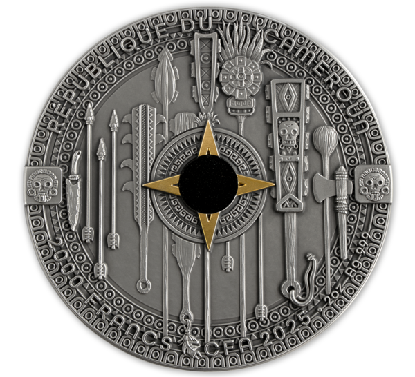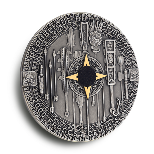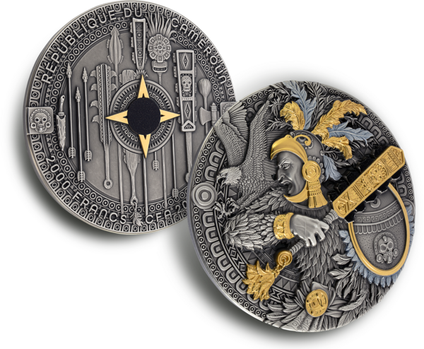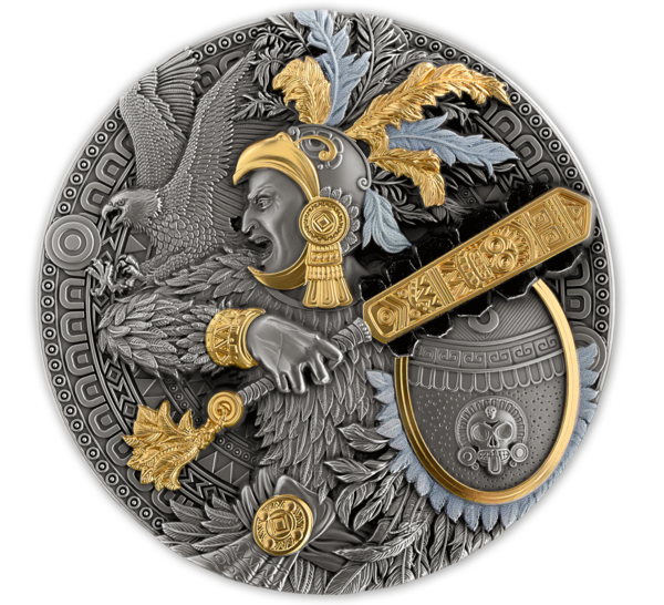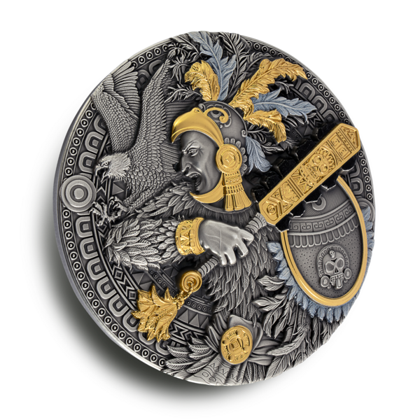 Reverz mince zachycuje impozantní postavu aztéckého Orlího bojovníka v plné ceremoniální zbroji. S mimořádnou precizností je ztvárněn oděv z orlích per a bohatě zdobená přilba, zatímco v rukou drží detailně propracovaný meč macuahuitl. Selektivní zlacení zvýrazňuje klíčové dekorativní prvky a vytváří výrazný kontrast s tmavou patinou stříbrného podkladu. Motiv letícího orla podtrhuje symbolické spojení s elitním válečnickým řádem. Averz zdobí kompozice tradičních aztéckých zbraní a rituálních předmětů, uspořádaných kolem centrálního motivu připomínajícího kompas, akcentovaného zlatými a černými detaily. Po obvodu jsou uvedeny zákonné atributy mince – země emitenta, rok vydání, nominální hodnota a ryzost kovu.