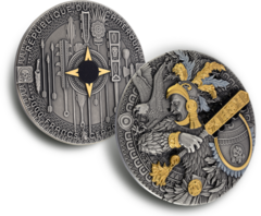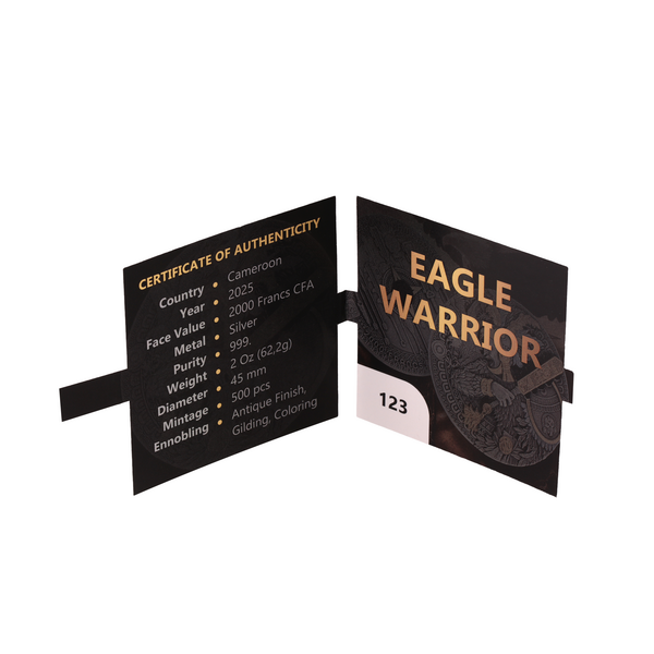 Eagle Warrior je výjimečná stříbrná mince o hmotnosti 2 oz ze série Aztec Warrior. Mince zaujme mimořádně propracovaným vysokým reliéfem, antickou povrchovou úpravou a selektivním zlacením, které společně dodávají motivu působivou hloubku a dramatičnost.