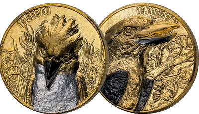 Reverzní strany obou mincí jsou věnovány detailnímu portrétu kookaburry ve výrazném reliéfu. Precizně ryté peří a charakteristický zobák ptáka jsou zvýrazněny kombinací černé platiny, černého a bílého rhodia, které vytvářejí silný kontrast s teplým tónem ryzího zlata. Design působí plasticky, dynamicky a velmi moderně, přičemž si zachovává vysokou uměleckou kulturu série Édition Signature.