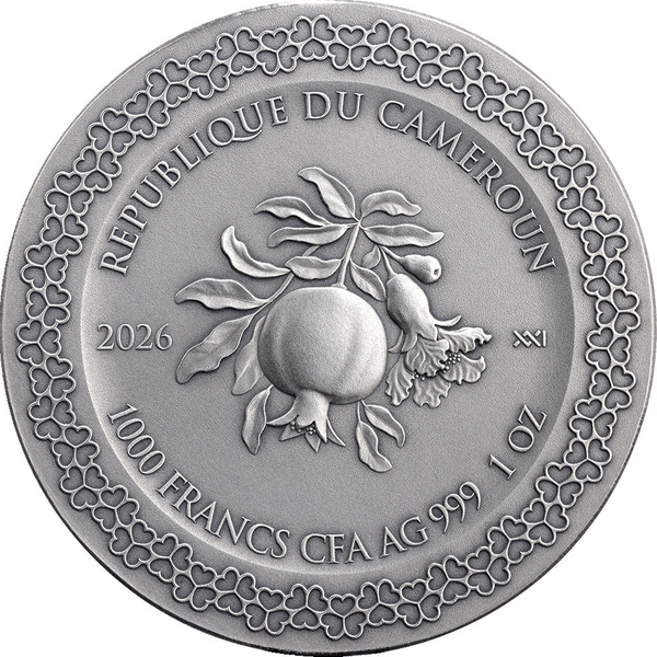 Na averzní straně je vyobrazen detailní motiv granátového jablka se stonkem a listy, doplněný jemně plastickým květem. Okolo centrálního motivu je umístěn kruhový nápis „REPUBLIQUE DU CAMEROUN“, označení roku vydání „2026“ a značka „XXI“. Ve spodní části jsou uvedeny technické údaje: nominální hodnota „1000 FRANCS CFA“, ryzost „AG 999“ a hmotnost „1 OZ“.