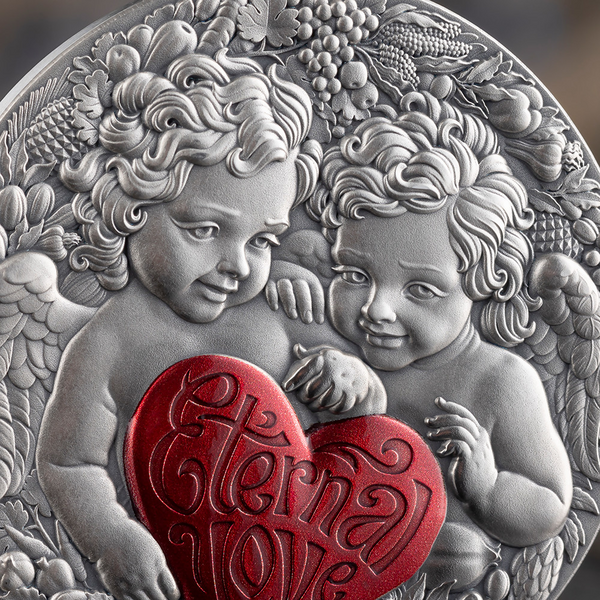 Exkluzivní stříbrná mince s motivem věčné lásky. Precizní vysoký reliéf, povrchová úprava antique finish a jemné kolorování dodávají motivu dvou andělských postav jedinečnou hloubku a eleganci.