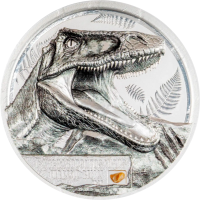 Tato exkluzivní stříbrná mince přináší dokonalé spojení numismatiky a pravěké historie. Vyniká precizním ultra high relief provedením, špičkovou technologií Smartminting® a obsahuje autentický fragment zubu Carcharodontosaura – jednoho z největších dravých dinosaurů.