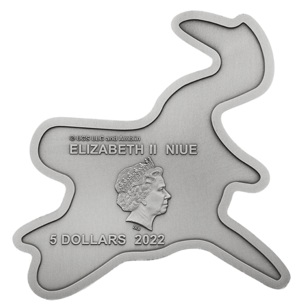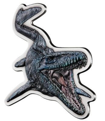 Třetí mince ze série tvarovaných mincí věnovaných Jurskému parku. Mince je ve tvaru obrovské mořské ještěrky - mosasaura. Je velikosti 2 uncí a upravena metodou antique finish, kterou získává starobylý nádech.