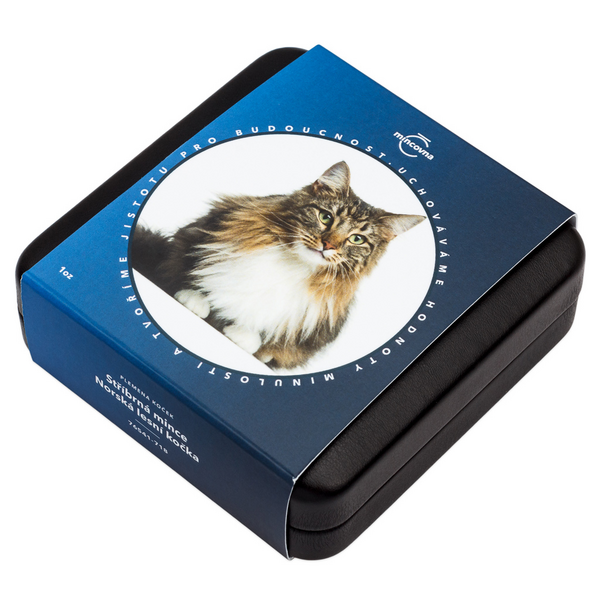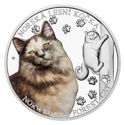 Na deváté stříbrné minci z cyklu Plemena koček se objevuje norská lesní kočka.