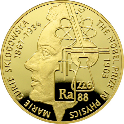 Na reverzní straně mince je vyobrazen portrét Marie Curie-Skłodowské z profilu. Po obvodu mince je uveden nápise "MARIE CURIE SKŁODOWSKA 1867–1934" a symboly, které odkazují na její vědeckou práci, jako například zkratka Ra pro radium a jeho atomové číslo 88, a také značka pro radioaktivitu. Na minci je také pod nápise "THE NOBEL PRIZE IN PHYSICS" uvedeno datum udělení Nobelovy ceny v roce 1903, což je odkaz na Nobelovu cenu za fyziku, kterou Marie Curie získala spolu se svým manželem Pierrem Curie a Henrim Becquerelem za výzkum radioaktivity. Na minci je rovněž vyobrazena číselná hodnota 226, což je atomová hmotnost radia. Na averzní straně mince je vyobrazen portrét Královny Alžběty II s nápisem "ELIZABETH II" nahoře a na spodní části jsou nápisy země emitenta "SOLOMON ISLANDS" a nominální hodnota mince "200 DOLLARS". Dále jsou na minci zobrazeny scény, které představují město Jáchymov, včetně budov a krajiny s nápisem "JÁCHYMOV" v popředí. Město Jáchymov je známé svými historickými doly na stříbro a uran. Ve dvacátých letech Marie Curie dokonce navštívila Československou republiku osobně. Přednášela zde a sfárala do nejstaršího jáchymovského dolu Svornost.