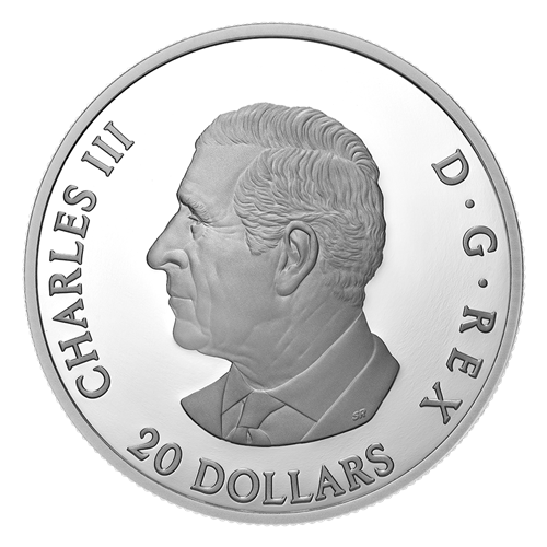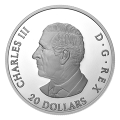 Příběh na reverzní straně této mince vznikl ve spolupráci s umělcem Bronsonem Jacquem z Nunatsiavut, který přináší novou interpretaci tradiční postavy havrana z inuitských legend. V dolní části návrhu je realisticky vyrytý havran sedící na větvi, obklopený stromy – symbolizuje každého z nás, zakořeněného ve svém vlastním já. Druhý havran, ztvárněný v basreliéfu, s radostí stoupá vysoko k nebi ve chvíli, kdy si uvědomuje, že je Havran – Stvořitel života. Achromatický hologram – trojrozměrný obraz vytvořený pomocí nanotechnologií – zjemňuje rysy úplňku a zachycuje jeho nádherný jas, zatímco na noční obloze tančí polární záře. Spektrum barev se zdánlivě mění v závislosti na úhlu pohledu, čímž vzniká iluze pohybu a osvětlení havraního peří. Averz mince nese portrét Jeho Veličenstva krále Karla III., jehož autorem je kanadský umělec Steven Rosati.