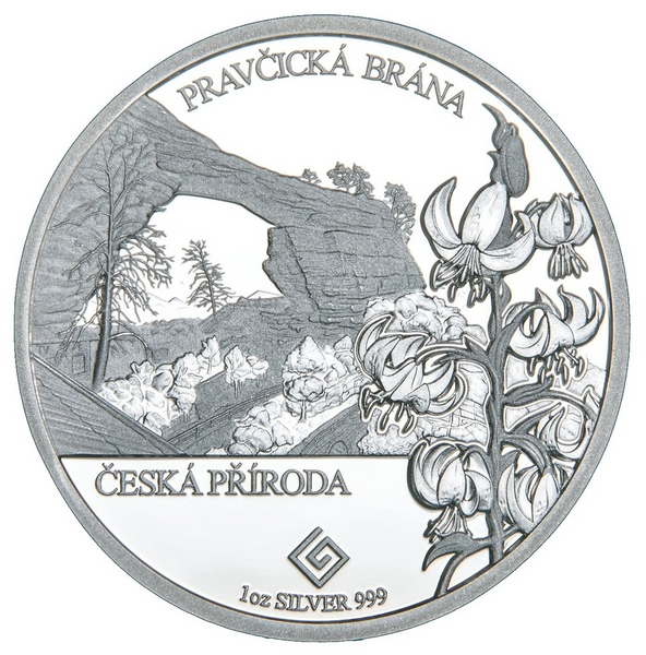 Druhá mince této série, Pravčická brána a Lilie zlatohlavá (Lilium martagon), zachycuje jeden z nejpůsobivějších přírodních skvostů České republiky. Na minci se v popředí vyjímá elegantní květ lilie zlatohlavé s jejími typicky zahnutými okvětními lístky, zatímco v pozadí se klene majestátní pískovcový oblouk Pravčické brány – největší přírodní skalní brány v Evropě. Dohromady vytvářejí harmonickou kompozici křehké krásy a monumentální síly, typickou pro českou krajinu.