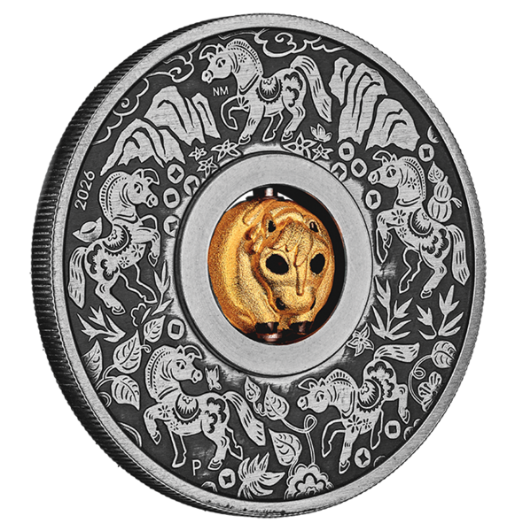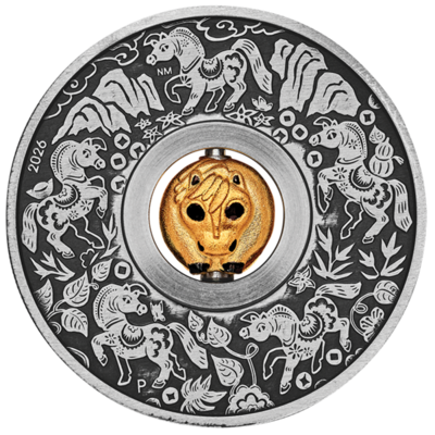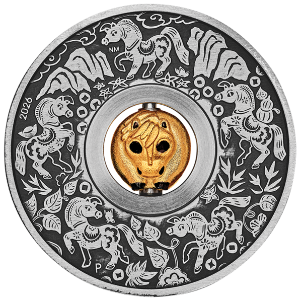 Stříbrná mince o velikosti jedné unce s rotující vložkou ve tvaru koně s úpravou antigue finish z Lunární série III pro rok 2026 – Rok Koně vydaná australskou mincovnou The Perth Mint. Rok Koně 2026 je sedmou mincí ze série 12 mincí a navazuje na Rok Myši 2020, Rok Buvola 2021, Rok Tygra 2022, Rok Zajíce 2023, Rok Draka 2024 a Rok Hada 2025.