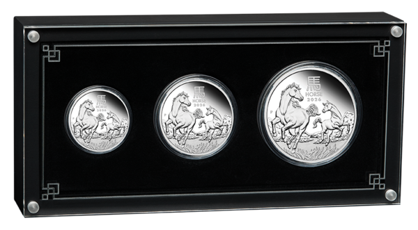 Sada 3 stříbrných mincí v kvalitě proof o velikosti jedné poloviny unce, jedné unce a dvou uncí z Lunární série III pro rok 2026 – Rok Koně vydaná australskou mincovnou. Rok Koně 2026 je sedmou mincí ze série 12 mincí a navazuje na Rok Myši 2020, Rok Buvola 2021, Rok Tygra 2022, Rok Zajíce 2023, Rok Draka 2024 a Rok Hada 2025.