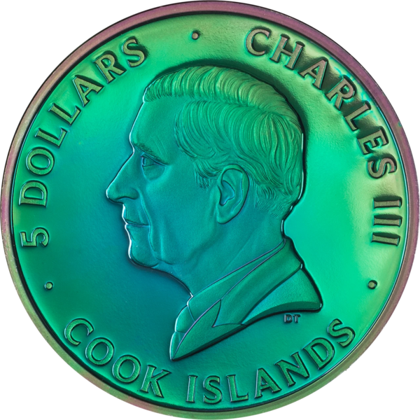 Na averzní straně mince se nachází stylizovaný portrét krále Karla III., doplněný nápisy „Charles III“, „Cook Islands“ a nominální hodnotou „5 Dollars“.