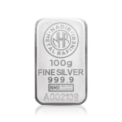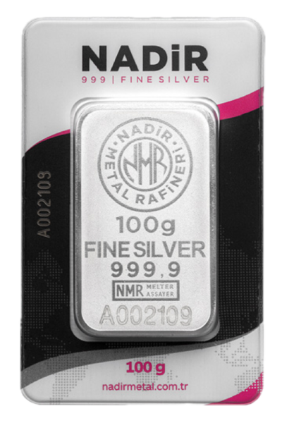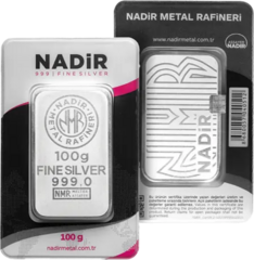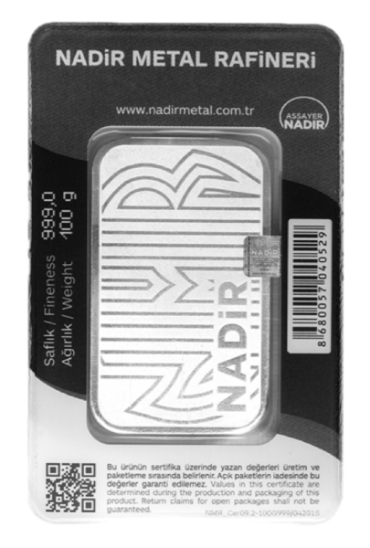 Stříbrný slitek 100 g od společnosti Nadir Metal Rafineri, jež je přední turecká rafinerie drahých kovů, založená v roce 1967. Je jediným tureckým výrobcem stříbra akreditovaným na světově nejvýznamnější burze London Bullion Market Association (LBMA), jejíž certifikace zaručuje nejvyšší standardy kvality a mezinárodní obchodovatelnost.