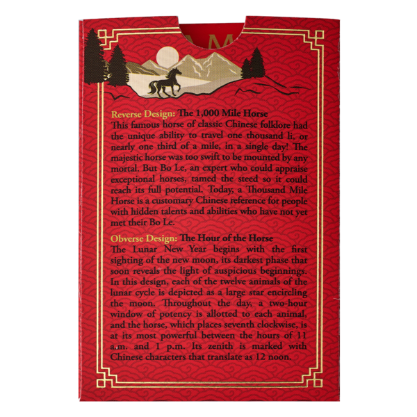 Lunární nový rok začíná prvním spatřením novoluní, jeho nejtemnější fáze, která brzy odhalí světlo příznivých začátků. Na averzní straně je každé z dvanácti zvířat lunárního cyklu znázorněno jako velká hvězda obíhající měsíc. Během dne je každému zvířeti přidělen dvouhodinový časový úsek síly a kůň, který je sedmý ve směru hodinových ručiček, je nejsilnější mezi 11:00 a 13:00. Jeho zenit je označen čínskými znaky, které znamenají poledne. Reverzní strana zobrazuje slavného koně z klasického čínského folkloru, který měl jedinečnou schopnost urazit tisíc li, tedy téměř jednu třetinu míle, za jediný den! Tento majestátní kůň byl příliš rychlý, než aby jej mohl osedlat obyčejný smrtelník. Ale Bo Le, odborník, který dokázal posoudit výjimečné koně, toto zvíře zkrotil, aby mohlo dosáhnout svého plného potenciálu. Dnes je Kůň tisíce mil běžným čínským označením pro lidi se skrytými talenty a schopnostmi, kteří ještě nepotkali svého Bo Lea.