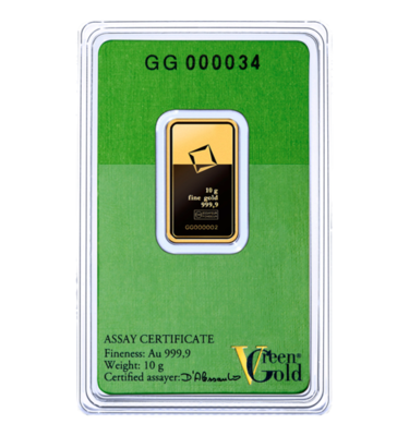 Slitek jsou opatřeny zvláštním certifikátem Valcambi Green Gold (VGG), což je mezinárodně chráněná značka švýcarské rafinerie Valcambi. Surovina pro výrobu těchto zlatých investičních slitků pochází výhradně z dolů, které dodržují nejvyšší standardy péče nejen o životní prostředí, ale také o zdraví, bezpečnost a lidská práva svých zaměstnanců podle pokynů mezinárodní organizace OECD. Celý proces zpracování slitků Green Gold je ve společností Valcambi zcela oddělen, od místa dodání přes rafinaci až po samotné odlévání a ražení.