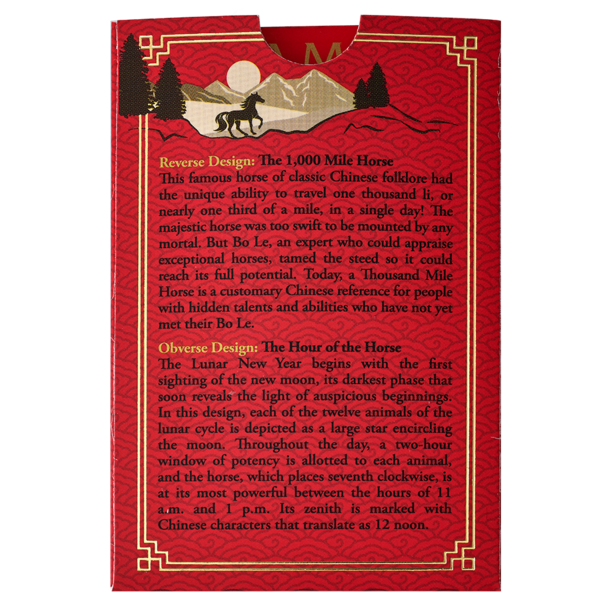 Lunární nový rok začíná prvním spatřením novoluní, jeho nejtemnější fáze, která brzy odhalí světlo příznivých začátků. Na averzní straně je každé z dvanácti zvířat lunárního cyklu znázorněno jako velká hvězda obíhající měsíc. Během dne je každému zvířeti přidělen dvouhodinový časový úsek síly a kůň, který je sedmý ve směru hodinových ručiček, je nejsilnější mezi 11:00 a 13:00. Jeho zenit je označen čínskými znaky, které znamenají poledne. Reverzní strana zobrazuje slavného koně z klasického čínského folkloru, který měl jedinečnou schopnost urazit tisíc li, tedy téměř jednu třetinu míle, za jediný den! Tento majestátní kůň byl příliš rychlý, než aby jej mohl osedlat obyčejný smrtelník. Ale Bo Le, odborník, který dokázal posoudit výjimečné koně, toto zvíře zkrotil, aby mohlo dosáhnout svého plného potenciálu. Dnes je Kůň tisíce mil běžným čínským označením pro lidi se skrytými talenty a schopnostmi, kteří ještě nepotkali svého Bo Lea.