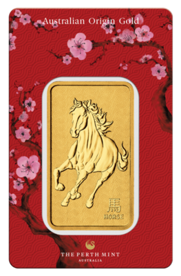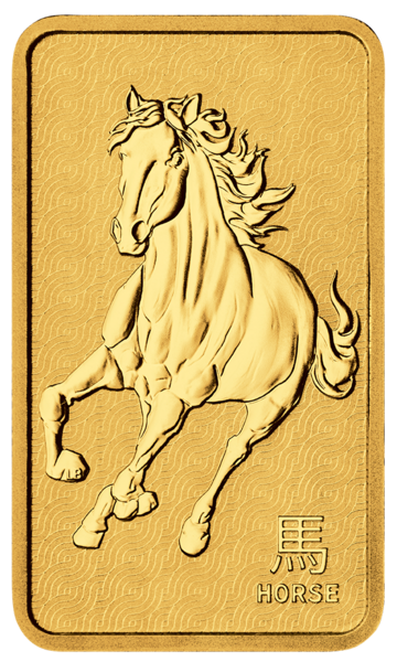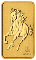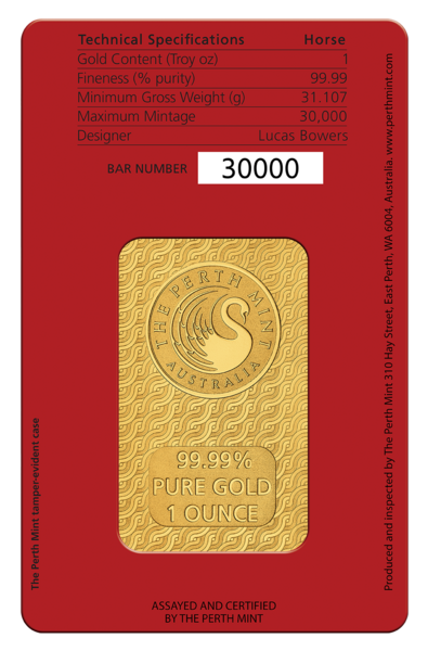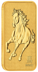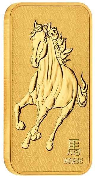 Tento pečlivě zpracovaný zlatý ražený slitek nese reliéf majestátního cválajícího koně. Součástí designu je nápis „HORSE“ a čínský znak pro „koně“. Zadní strana slitku je označena registrovanou značkou The Perth Mint u London Bullion Market Association — stylizovanou labutí, která symbolizuje naši 125 let starou pověst kvality. Logo, hmotnost a ryzost slitku jsou umístěny na pozadí se stejným vzorem. Ražený slitek obsahuje bezpečnostní prvky v podobě mikrolaserem vyrytých písmen, která jsou viditelná pouze pod lupou.